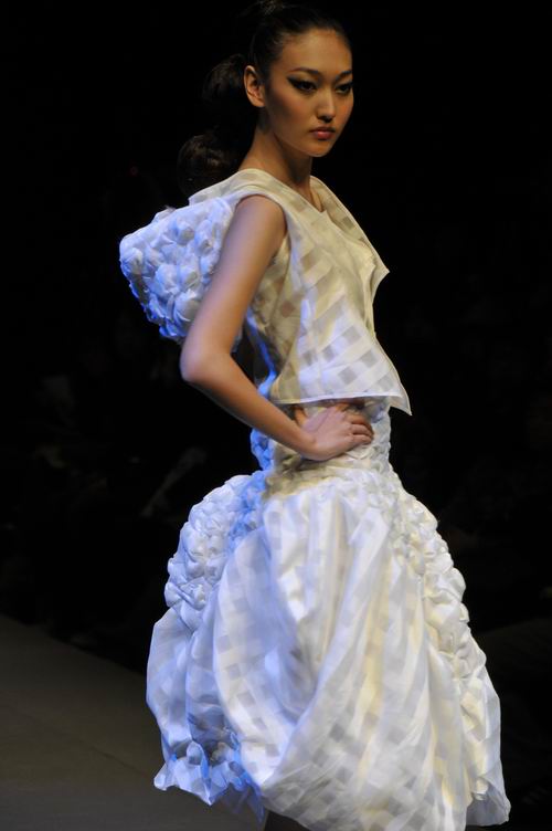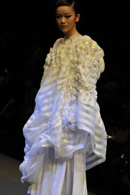 据网易独家报道,本次秀中一套名为“自由的萤火虫”作品,尤其引人注目。通身洁白无瑕的衣服上,点缀着七彩闪烁的灯光。当全场灯光渐暗,一道追光打在模特的身上,随即闪起点点星光,呈现出梦幻般的效果。让人不禁联想到夏夜的萤火虫,在弥漫着花香的夜空中自由飞翔,一闪一闪,渐渐融入繁星闪耀的夜空。这套作品用料大胆,设计独特,采用创新结构设计,并将特殊材料——灯,大胆的运用于服装的设计之中,呈现出别样的效果。