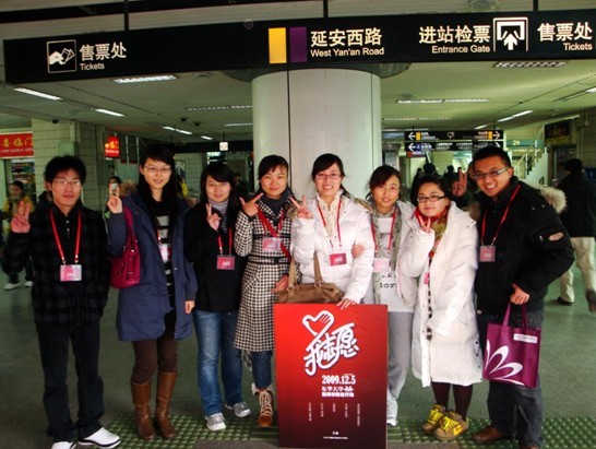 12月5号是国际志愿者日,在这一天里,服装学院研究生8名志愿者到延安西路地铁站参加志愿者日服硕09级团日活动之“地铁的速度,文明的角度”活动。大家早上九点钟就风尘仆仆的赶到了地铁站,来参加这一项有意义的活动。