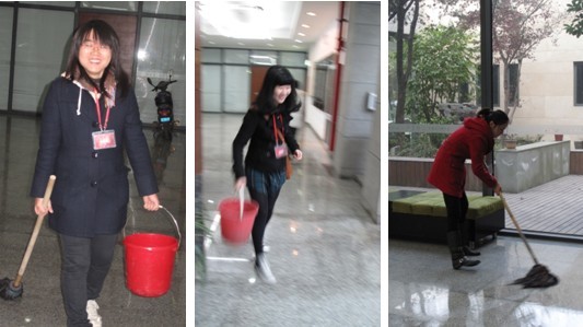 一屋不扫,何以扫天下?此次的志愿者活动从规范学生日常行为入手,从校内和身边做起,在研究生宿舍楼下进行大扫除。在活动的过程中,同学们不分班级,不分你我,相互帮助。尽管是在天气寒冷的12月,但也扑灭不了同学们参与活动的热情,大家都起个大早,满怀热情的来到宿舍楼为活动的开始做准备。提水、扫地、擦窗、拖地,每一个环节同学们都是一丝不苟的完成。国际志愿者德兰说:“爱就是要在别人的需要上看到自己的责任。我们个人也只是一滴水,终会滴进海洋,看似微不足道,但海洋就是需要那滴水。”在充满朝气的芊芊校园里,志愿者们就是那点点滴滴的水,滋润他人,在流动的同时也净化了自己的心灵。