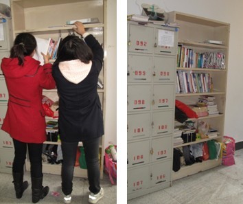 图书馆的学生自习室内有很多同学们自习后遗忘、丢弃的书本和物品,志愿者们将这些物品整齐地整理到书架上。这些志愿者们不怕脏不怕累,用手去在废弃物中将一本本书进行分类、摆放,并且在不打扰同学们自习的情况下,轻手轻脚地将整个自习室擦扫干净,为同学们自习提供了一个整洁舒适的环境。