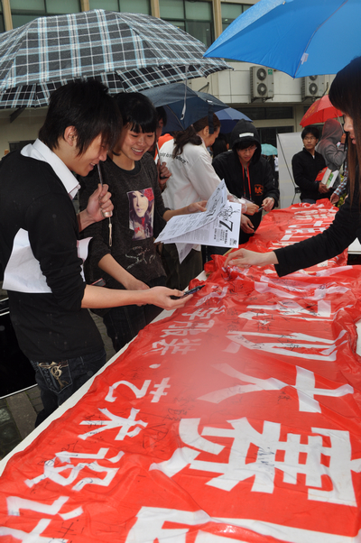 “时尚礼仪大赛”经过前几届的筹办与宣传,已经在同学们的心里有了深刻的印象,各届大赛中不同的主题又给了不同的乐趣与新颖,本届“世博缘·城市情”的宣传主题更是让同学们感受到了上海世博会的紧密联系,也更加的时尚,在我们工作人员饱含热情的宣传与推动下,上海各大高校的研究生与一部分海外留学生对本届“时尚礼仪大赛”有了更深的了解,同时也引起他们的更加浓厚的兴趣。越来越多的同学在宣传横幅上签上自己的名字,积极地支持和参与此次“研究生时尚礼仪大赛”。
