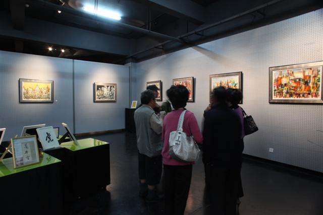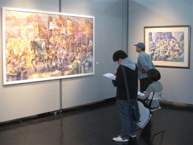 艺术类研究生。虽然他们的年龄相差很大,但是展现给我们的是耳目一新的感觉。翁纪军 老师带给我们的是非常少见的漆画,内容主要是佛陀和石窟,那浓重而光亮的画面,表现着佛教文化的千年的沉重与色彩。韦康 老师的橡皮笔油画,画面已经从具象发展到抽象,表现的是现代城市给我们的感觉。赵玉龙 老师的油彩,洋溢着青春的气息,那宛如中国华中泼墨山水的画法又突出了中西文化的交融。王克良 教授的油画加丙烯颜料的作品,带给我们更多的是一种抽象韵味,使得油画布不再浓重,感觉意识在流动。沈黎明 老师的作品焕然一新,原来他的水彩画以具象风景为主,这次的画展作品已经从具象往抽象发展,特别是源自西藏唐卡内容的格萨尔王巨幅水彩画,不仅是首次用水彩表现历史人物画主题创作内容,同时,画这样人物众多大场面的大幅水彩画。也是很少见的。