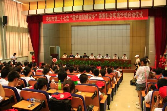 当日下午,实践团的成员作为合作院校代表团,应邀在安阳师范学院参加了安阳市第二十七次“我把知识献家乡”暑期社会实践活动启动仪式。安阳市市委宣传部部长郑俊峰同志、副部长储旭光同志等诸位领导以及社会实践的学生代表共约220人参加了此次启动仪式。会议中,赴安阳实践团与安阳师院“关爱农民工子女”实践团队达成合作意愿,并进行了深入的讨论。两校学生畅所欲言,建立了良好的友谊。