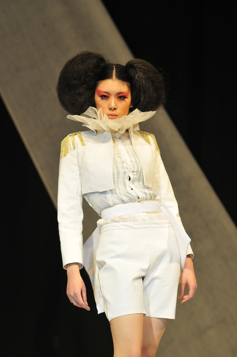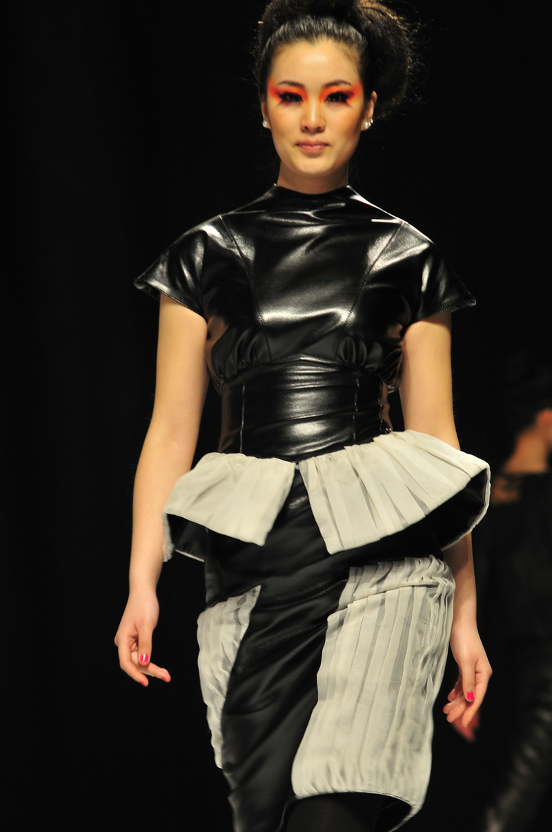 随着悠扬的音乐响起,灯光缓缓照亮舞台,我们迎来了第一部分的展出。当开场模特出现时,那优雅妩媚的羽毛小礼裙,就已经将在场观众深深吸引。粉红色渐变的裙身,高高翘起的头冠,马鞍式的臀部设计,无不彰显着中日班同学在手工和设计上的良苦用心。随后又有以蕾丝为主的短裙,加入折纸艺术的小西装以及雪纺制成的长裙出现,最后几件出场的服装更是集聚奢华与浪漫与一身,婚纱般的公主裙加上羽毛制成的领口带给人如梦似幻的视觉享受。总体来说,第一部分的展出都是以今年的流行色——白色为主,设计也更倾向于女性化的柔美。在人们的掌声中,第二部分开始了。这几十套衣服明显更具时代感,银灰色的大量使用和紧身收腰的设计,再加上金属搭扣,绑带的点缀让人们感受到了都市摩登女郎的气息。从第三部分开始,女装一统天下的局面被打破,出场便是四套以黑白为主的男装。其中有一套男装故意将裤腿挽起,露出了鲜明的红袜子,严谨的西服上装和带着戏谑的下装体现出了设计者的匠心独运。接着就是几套凸显名媛气质的套装,狐狸围脖起到了很好的修饰作用。在此后的设计里,日本熟稔的解构设主义得到了极大的应用,长短不一的裤腿,只有半边的小西服都让人们赞叹。在第四部分当中,之前隐隐约约的朋克,摇滚元素都凸显出来,很多服装都以黑色为主,皮革得到了大量的应用。中间还穿插着精妙的褶皱和闪光的金属配饰及夸张的育克、衣领。男装被融进了女装,使女装更具有了阳刚之美。第五部分,可谓是今晚最特殊的了。插满管子的“太空服”、夸张怪异的动物造型、像“中国馆”一样的帽子,无不体现出设计者天马行空的想象力。总的来说,很多同学都偏向于朋克、哥特的设计风格,在经典中追寻流行并加入自己的独到的理解,大胆的应用各种材料去完成自己的想法,其严谨精巧的手工工艺和时尚独特的设计,都使得本场秀获得巨大的成功。