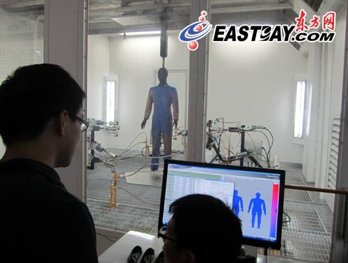 燃烧假人系统由该校服装学院功能防护服装研究中心承担实施,其最大亮点在于:它能模拟中国人体型构造,可在不同活动姿势下精准感知高温热流,能精确预报身体皮肤烧伤程度,并具有高仿真模拟火场高危环境的燃烧模拟环境实验室。