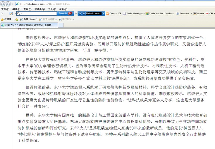 校长徐明稚看来,燃烧假人和燃烧模拟环境实验室的研制成功与该校“有特色、多科性、高水平大学”的办学理念密切相关。因为该系统综合运用了生物传热分析技术、材料改性技术、人机工程制造技术、传感器技术、燃烧工程和自动控制等技术,属于服装科学与生物物理学等交叉领域的尖端科技,而正是JKF 捷克论坛