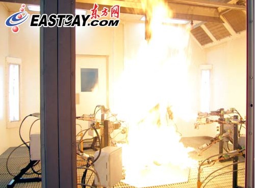 图片说明:燃烧假人周围安装了6组12只喷火器,每个喷火器可在2-3秒时间内喷出3米高的火焰