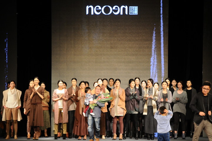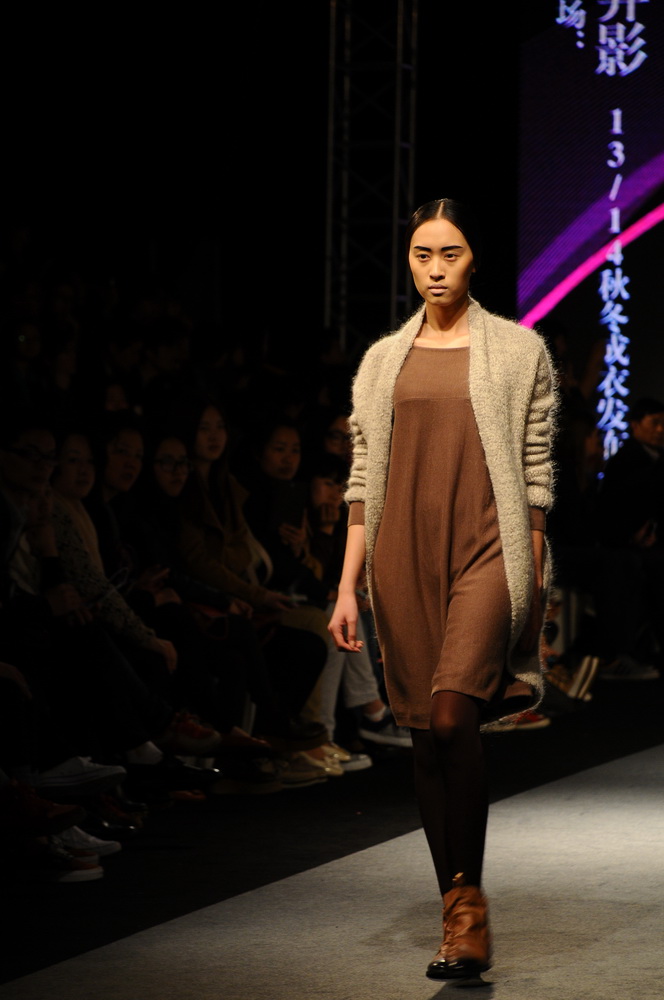 之后灯光暗下,随着灯光再次的亮起,棕色系为主的冬季服装开始一一呈现在我们眼前。冬季作品款式复杂多变,而同一色系的围巾则成为了不可缺少的配饰。风衣成为了冬季作品中出现最多的服装款式,配以长裙或者九分裤以及高跟鞋,相近颜色的厚底高跟鞋,平底皮鞋,颜色过渡的手提包等,精英女性的干练和美丽展现无遗。本次展出成衣均采用纯天然的材料,无任何化纤,适宜穿着。整体设计风格颇具中国传统之风,简洁分明的装束,乌黑发亮的长发,有棱角加黑的眉毛,表现出的优雅温柔性格,无不突显中国女子之美,中国传统之美。