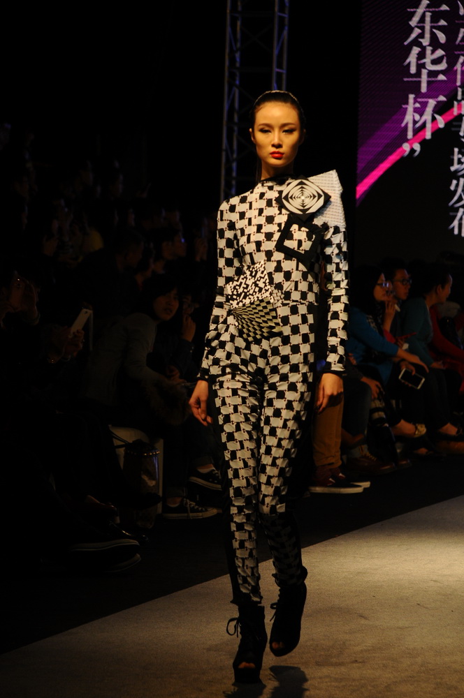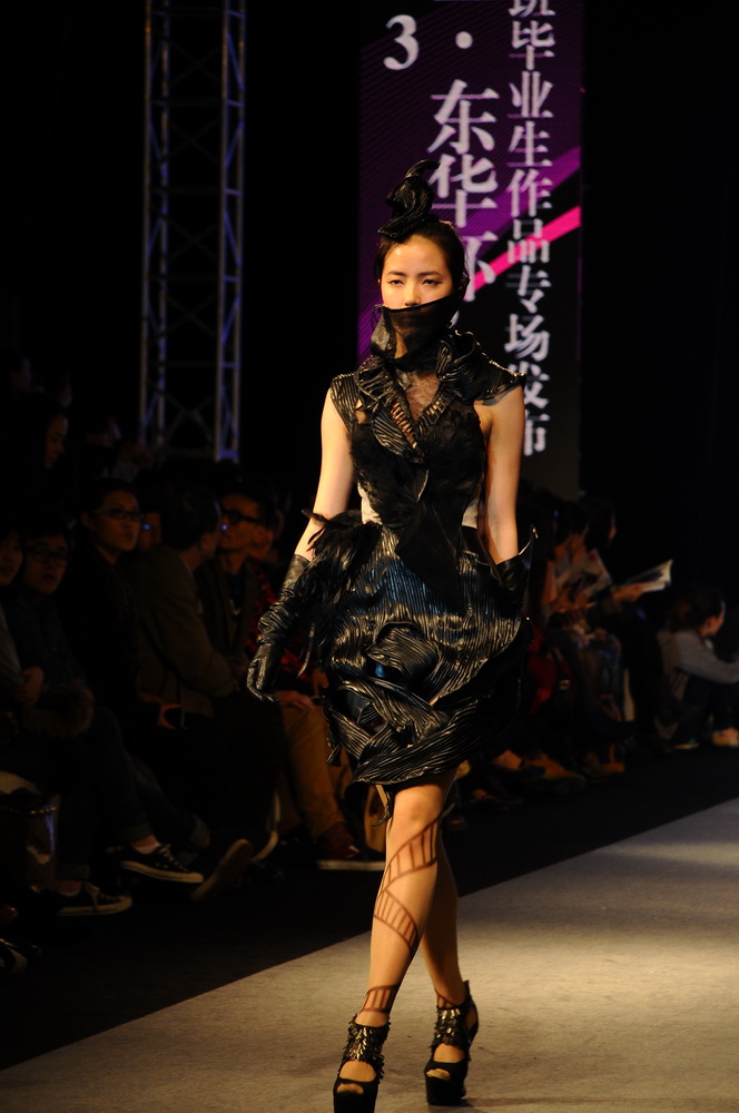终于,在万千观众的翘首期盼中,“雅莹•东华杯”中日合作班毕业设计作品专场发布会于上海世贸商城四楼盛大召开。离走秀还有将近一个小时的时候,上海世贸大厦展厅挤满了对此次“雅莹•东华杯”中日合作班毕业生作品满怀期待的人们,有心怀忐忑等待获奖结果的参赛设计师们和他们的辅导老师,看台上交际等待着开场的观众,来自全国各地知名服装品牌公司的嘉宾。现场的摄影师不断变换位置以求得到最佳的角度,调音师和主持人一遍一遍的磨合着。随着动感的旋律响起,屏幕上放映的服装摄影点燃着全场的气氛,终于四周灯光暗下,旋律一转,只见模特身着设计精心策划一个月的服装总T台的尽头缓缓地走出来。