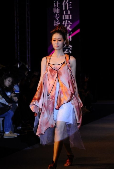 倪明女士的设计特色在于通过手工染色、丝网印、手绘、数码印花等方法,让一块普通的面料呈现出美丽的外观。此次个人秀展既充分发挥了她独一无二的个人优势,又紧紧贴合“海派时尚设计”这一大概念,向观众席吹来了一阵海派之风。作者独特的设计风格和理念不仅展现于“‘绳’飞‘带’舞”这个美丽的名字中,更是在一件件华服中得以诠释。