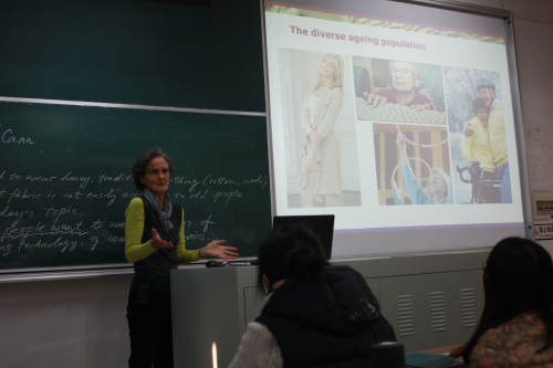 McCann教授的演讲题为“Design for ageing well”。在两个小时精彩的演讲里,她向师生们详细介绍了可穿戴技术的发展历程、研究现状,及其在老龄服装设计中的应用及展望。
