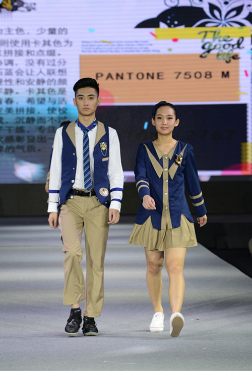 灯光璀璨,一号作品名为《璀璨年华》,采用民国时期学生装的特点,配以衬衫、外套、大衣的组合,增加了校服样式的多样化。二号作品《恰同学少年》,设计师实地考察了贵州省兴义市第八中学,将当地比较有特点的传统元素运用到校服的设计中。第三位设计师的作品以粉色格子和藏青色为主题,主要凸显了校服的舒适度。第四位出场的《绘·几何》主要以白色、黑色为主体,冬季校服加以黄色外套,有温暖之感。第五位《蓝色青春》以蓝灰为主体,纯真自然,可爱活泼。第六位《领尚》针织面料与格子相拼接,夏季使用蔚蓝与湛蓝色,冬季则运用中山装元素,有成熟感。第七《绿光》以四叶草为灵感,冬季青、绿与蓝色为主,点缀以亮黄色,夏季则以白色与格子为主。第八《闽尚》凸显着海洋与闽南文化,冬装风衣与校服款式相结合,使用藏蓝和黑色,夏装为藏蓝和白色,裙摆运用海波浪的裙边。第九《那些年我们一起追过的时光》运用蓝色与玫红,张扬而不张狂。第十为短外套的运动系列,第十一《青春》以天空、海洋、浪花为灵感,深深浅浅的蓝色相交叠。十二《群青》予以中国特色,加以格子点缀,富有韵味。十三《融》以深灰为主色调,饱有儒家儒雅之感。十四《同桌的你》,主色调青加红,可爱俏皮。十五《星辰大海》深深浅浅的蓝色相呼应,十六《我和周一有个约定》运用拼接,青春活泼,十七《舞文弄墨》运用扎染,有中国传统的水墨风特色。十八《一抹彩》以白色、黄色和群青的对比,突出了“彩”的主题。十九以运动风为主,二十《张扬青春》正如它的标题,青春活泼,张扬肆意。二十一《致青春》,冬季灰色与少量格子拼接,夏季灰色与白色,作者别出心裁的在裤子膝盖处做了可调节拉链,使其可在长裤与短裤之间转换。二十二运用拼接手法,简约的运动风。二十三运用男装与女装的撞色,凸显活力。二十四《感知》以卡其色为主,搭配以藏青、浅蓝、浅绿,既和谐又富有色彩感。