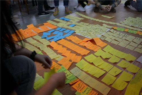 老师们用互动的方式引导同学们进行头脑风暴,打开了他们的思路也涌现了许多优秀的想法,用掉了近3000张A4纸,3000张Post-it,并从中选出有深入价值的方案进行再讨论,直至成型为一个完整的方案并建模、制作展板及汇报PPT 。