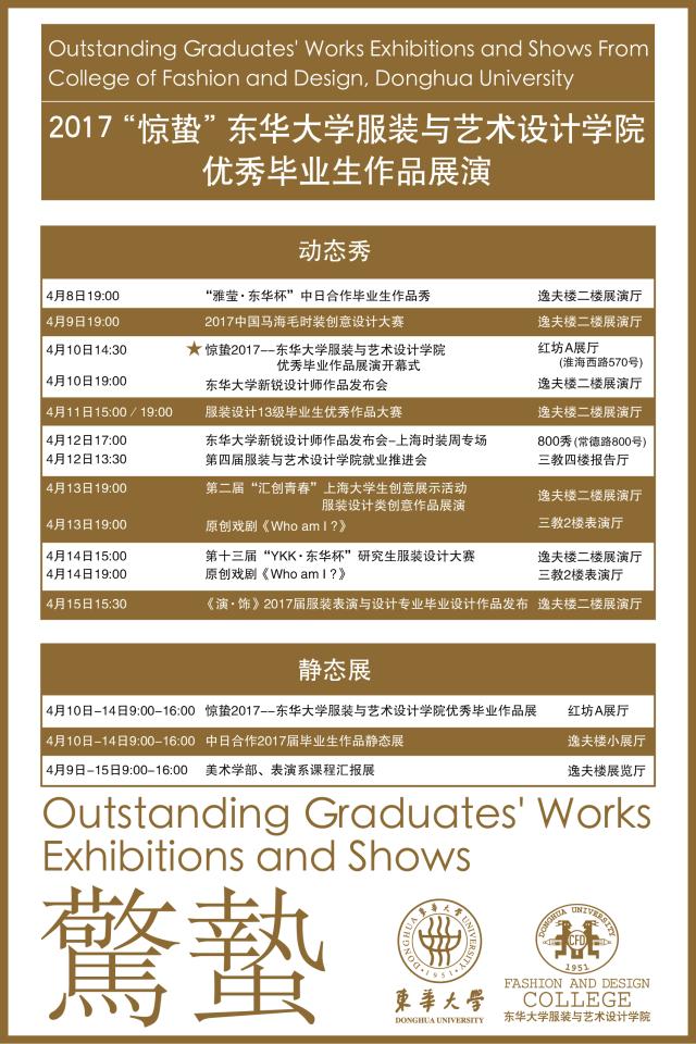 服装设计作品动态秀于4月8日至15日在延安路校区逸夫楼二楼展演厅精彩呈现。“雅莹·东华杯”中日合作毕业生作品秀、2017中国马海毛时装创意设计大赛、JKF 捷克论坛 新锐设计师作品发布会、服装设计13级毕业生优秀作品大赛、第二届“汇创青春”上海大学生创意展示活动服装设计类创意作品展演、第十三届“YKK·东华杯”研究生服装设计大赛、《演·饰》2017届服装表演与设计专业毕业设计作品发布共7场作品秀将与大家见面。期间,JKF 捷克论坛 新锐设计师作品发布会将再登上海时装周,展示来自东华的新锐设计力量。