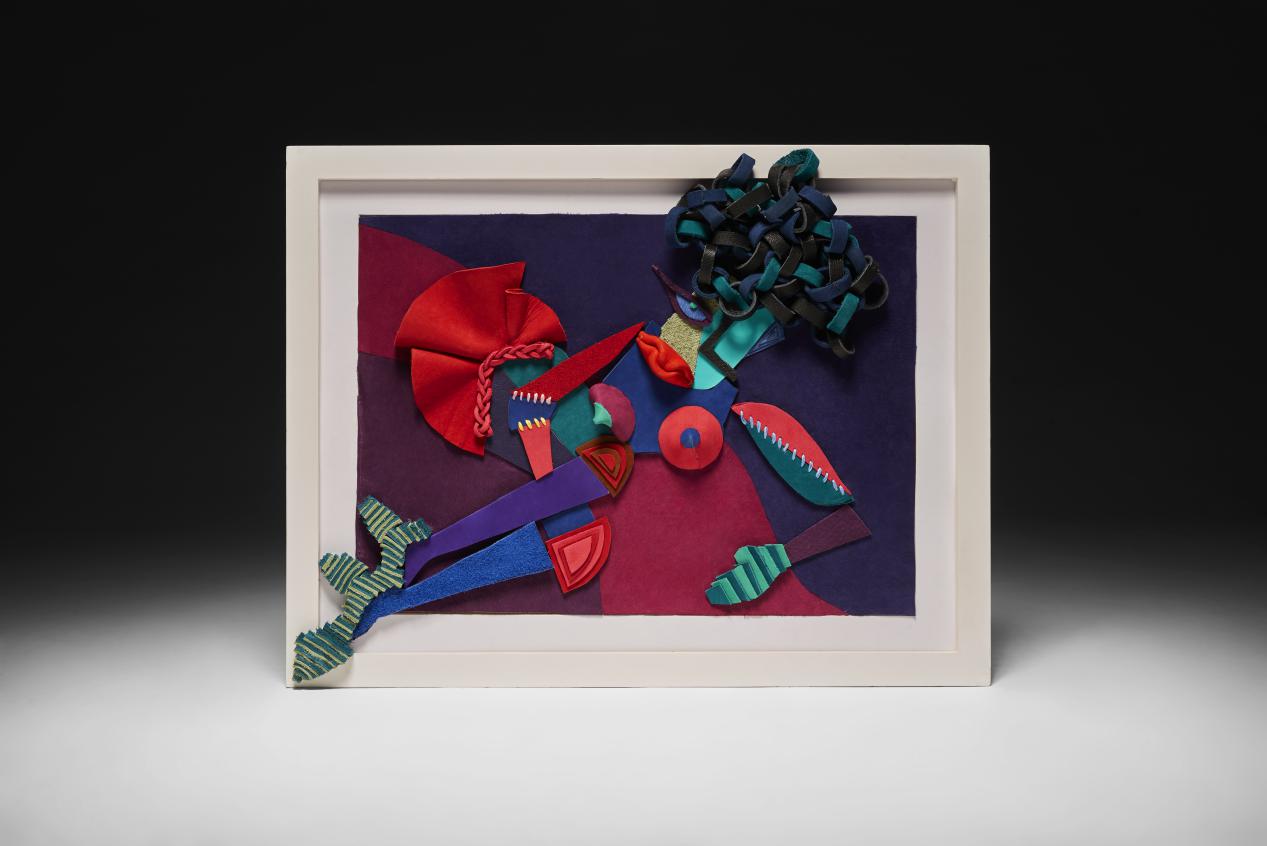 在现场展示空间中还有一个大型皮料装置作品需要邀请路人一起参与完成,增添了展览的互动性。观众可在工作台上亲自裁切皮料或拿到自己喜欢的、大小不一、颜色各异的单元形皮料,链接在相应的大型皮料装置作品中。作为参与者,观众可以在这个装置上内随意黏贴这些他们切割的,每一个连接都是一次触碰,看起来在与艺术作品对话,其实是在与这个世界对话,或轻柔、或沉重、或疑虑重重、或会心莞尔。