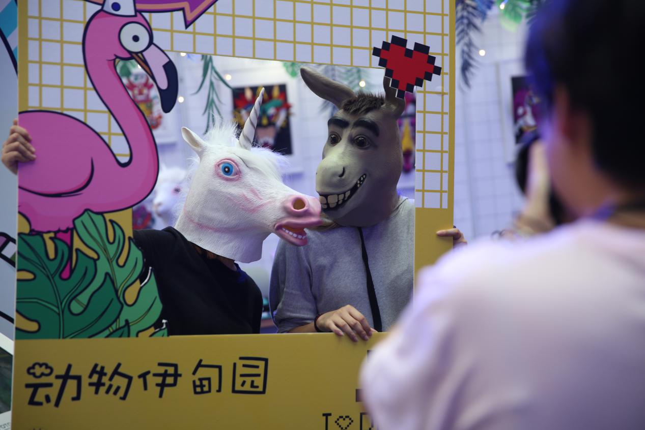 展演现场有很多动物的头盔,可以供大家佩戴拍照,并现场免费打印照片,增加互动性的体验。