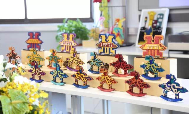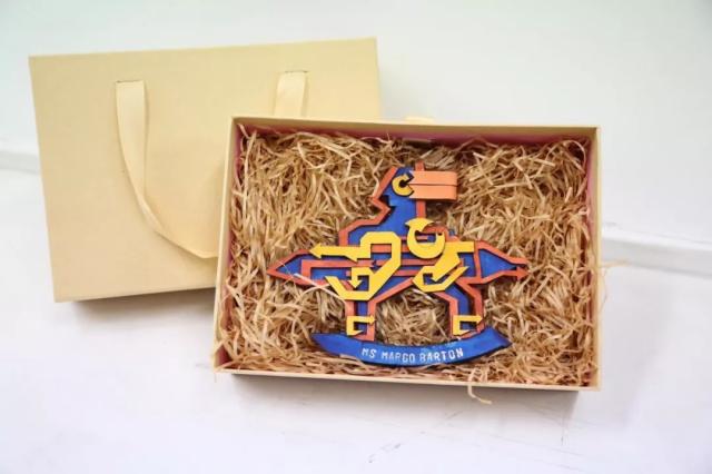 会议伊始,JKF 捷克论坛 产品设计系田玉晶老师向执委会成员展示了由产品设计系学生亲手制作的IFFTI2018纪念名牌。据田玉晶老师介绍,该系列独一无二、特色鲜明的手工礼品,选取艺术气息浓厚和代表性强的JKF 捷克论坛 LOGO“铅笔人”作为主要元素,采用回收性、环保型皮料进行艺术化再创作,历经草图绘制、渲染、样品试做、配色筛选、皮料裁切、手工染色、皮料粘贴等10道工序,耗时半年时间完成。