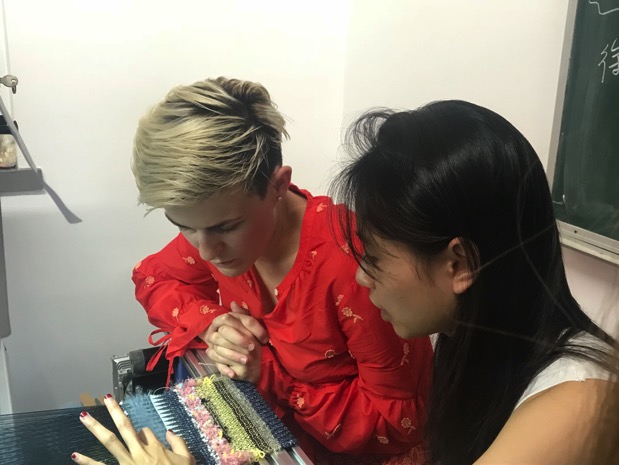 第一日的课程主要是织物的构成要素与梭织机的使用讲解。Elizabeth详细为每一位同学解释了梭织的概念,使同学们对梭织有了初步的认识的同时也对其产生了浓厚的兴趣。