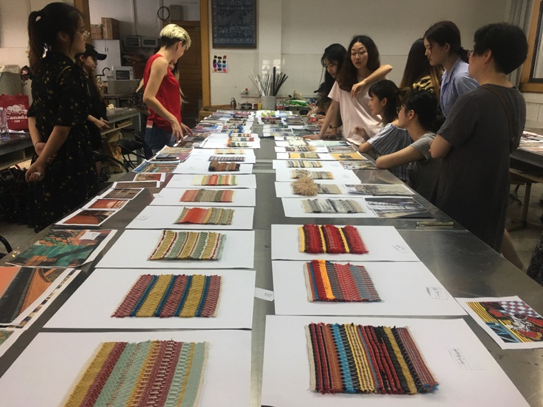 最后一日的课程小结的环节也是检验大家作品的环节,每一位同学将自己的作品展示在桌面上供大家品评鉴赏,Elizabeth也为每一个人进行了讲评。期间Elizabeth还为我们进行了关于纱线织物设计的相关精彩讲座。