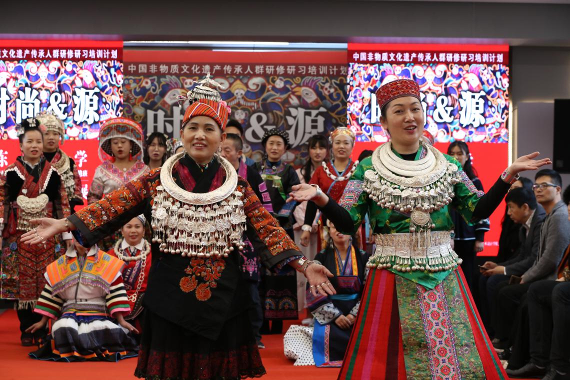 第五期非遗研修班共有来自贵州各个民族的18名学员和上海绒秀代表2名。研培班坚持“见人、见物、见生活”的保护理念,特别设置了“课堂走进留学生中国文化节”环节,紧扣文化节“迎进博,共参与,学非遗,知中国”的主题,将课堂搬进文化节,以动静结合的教学研修形式立体呈现传统刺绣的工艺、魅力。教学主管陈彬介绍了本次非遗研修设计是首次精选4位本科毕业生,每位毕业生结对5位传承人设计5套服装成为一个系列,共20套服装(4个系列),使服装套系的完整性更强,并将优中选优参加国际服装大赛。
