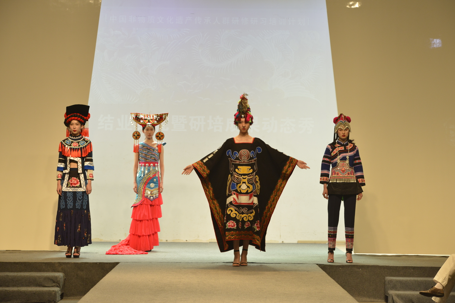 非遗学员代表在分享结业喜悦的同时,对研培老师的付出与陪伴表示诚挚的感谢。收获最大的是和学生新锐设计师们结对设计作品,古朴与精致碰撞、传统与现代交融、民族与时尚牵手,展示了彝绣特色服饰带来的视觉盛宴。