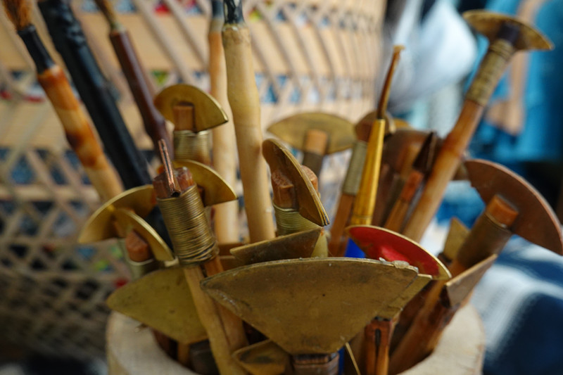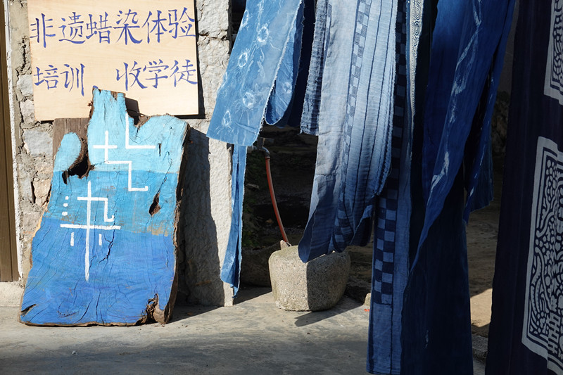 艺染店内的陈设有条不紊,有两条提示语可见主人风格。一是“谢绝还价!”因为主人开的是实价!一件上衣才三五百块,傅老师看后有点激动“你不可以卖这么便宜!别人都卖上千或几千了!一个如此帅气、年轻的大小伙子,将自己如此美好的青春时光用在这一丝一缕的染织和一针一线的刺绣和缝制上,那是生命的价值!不可以贱卖了!!!”“可是人们还是觉得贵呐!”王艺稍有激动仍然浅浅地笑着。另一条是“试后请物归原处!”可以看出店主比较喜欢整洁和严肃的一面。店里的每一样东西都是王艺亲手设计制作。这个正当韶华的青年如此静心倾心于民族服饰和传统手工艺让我好生感动。“谈女朋友了吗?”我笑着问。“还没呐!”王艺搔着头回答。“你一个人整天守在店里,怎么会遇到女孩子呢?”“那就不找了呗!”王艺仍然浅浅地笑着。“那怎么行呢!”我大声道。王艺轻描淡写的回答其实有一种找不到志同道合的伴侣将独自前行不改初心的决心。所有老师都被这个青年感动了。傅老师热心指导王艺对售卖的物品进行了重新分类,提出哪些该提价,哪些需提升,哪些可以网上加推。