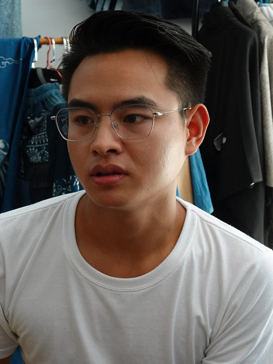王艺是东华第五期学员,我印象深刻。这一期学员中有一老一少两位男绣师,年长的外向年少的内敛挺有趣。年少者便是王艺,挺帅气的95后小伙儿,总是浅浅地笑着,气质有些沉郁,在班级群里寡言少语,很少发声,同学有开玩笑说他长得很像张国荣的。招生时便知道他是因为家传兼个人兴趣喜欢上了染织绣传统工艺,大学毕业后选择自主创业。但实在没想到我们师生会在兴义的5A景区遇见。兴义市非遗中心的两位主任对王艺的店也有印象,并说那条街生意不好,不只是王艺一家,盖因这条“下纳灰布衣寨”线路,行人稀少,游客鲜至。