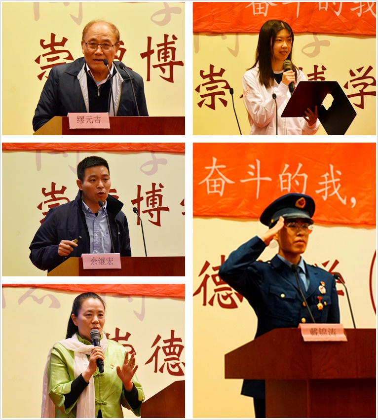 五名师生分别以中国梦、工匠精神、文化自信、奋斗青春、军旅刻痕为主题进行宣讲。学院关工委分会缪元吉老师用“五句话”点题,告诫青年人要扎实沉稳,学习工作要立足中国梦、同爱中国梦、共建中国梦。余继宏副教授和柯玲教授,分别从大国工匠精神和非遗文化传承出发,彰显大国风范,树立文化自信,将深入研究中国传统文化作为传承发展民族精神的重要使命。学生王冠华和戴锦涛,分别代表了国庆阅兵后“奋进上海”彩车上的“花仙子”和携笔从戎、保家卫国的“兵哥哥”,用最美的青春和不息的奋斗,来告白伟大祖国。