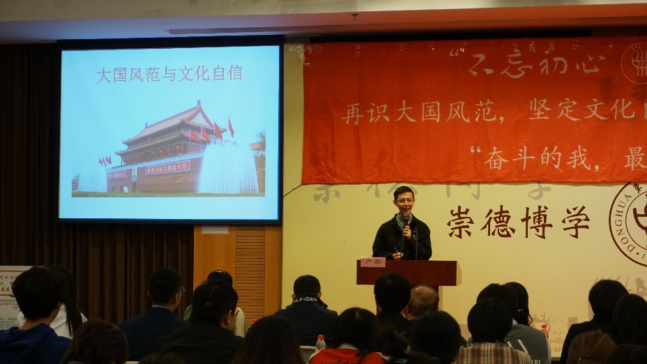 特邀嘉宾严蔚老师用风趣幽默的语言,为师生带来《大国风范与文化自信》主题讲座。严老师带我们一起领略了中国细腻且深远的文化底蕴,欣赏了几千年来有序且未中断的大国风范。他指出,要将文化自信根植于当代人的血肉中,文化自信不是固步自封,更应开拓创新与时俱进,这也正是时代赋予的责任担当。