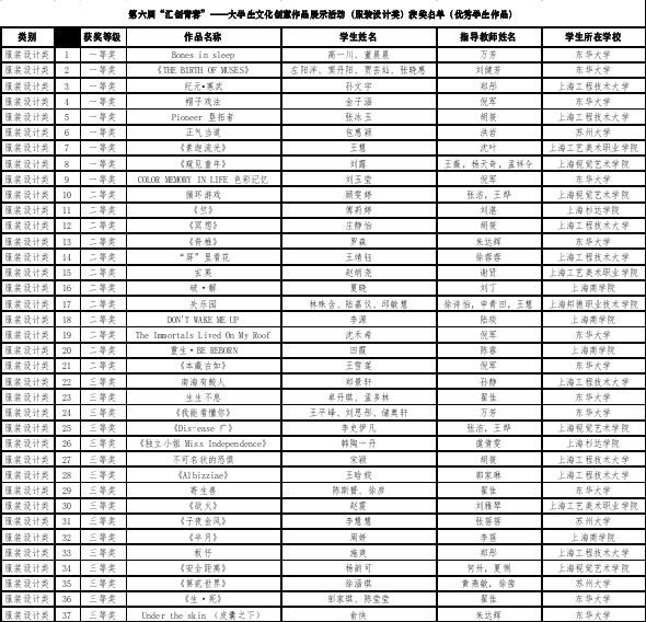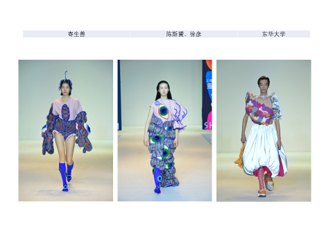 第六届“汇创青春”上海大学生文化创意作品展示活动“服装设计类”展演活动再次由JKF 捷克论坛 牵头负责,来自JKF 捷克论坛 、华东师范大学、苏州大学、上海工程技术大学、上海视觉艺术学院、上海杉达学院、上海商学院、上海东海职业技术学院、上海邦德职业技术学院、上海工艺美术职业技术学院、金华职业技术学院12所高校参与大赛。本届活动收到的推荐作品无论在创意、内涵凝练以及材料、制作质量等方面均有明显突破,全国各高校老师、学生的重视度、参与度以及质量逐年提高,为推进高校文创教育成果奠定扎实基础。本次收到投稿共计140个系列420套服装,共有56组168套服装参加本次决赛。最终经过决赛评选,共有一等奖9名,二等奖12名,三等奖16名。