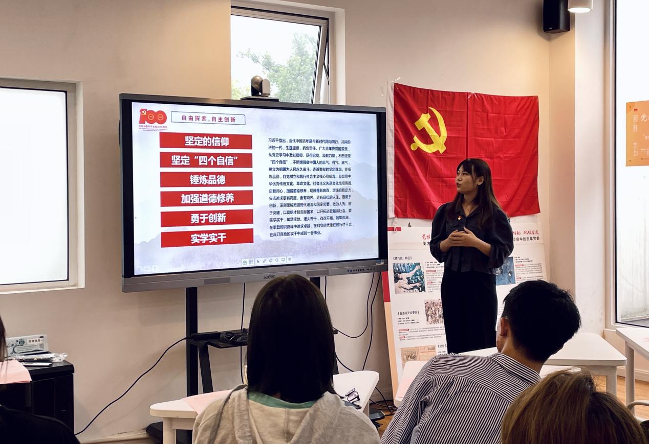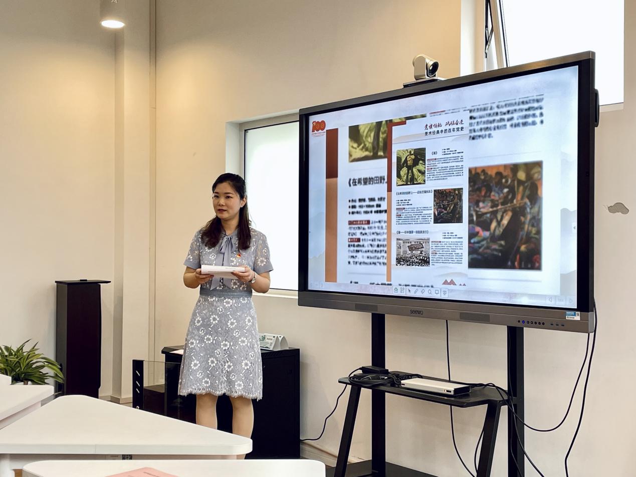 复旦大学教师代表杨洁介绍了共建联学活动的前期工作与成果。学生代表赵旭航做了“中国心理学百年发展与展望”的主题分享,结合心理学学科历史进行百年回顾,讲述“中国特色”心理学发展道路,不断推动社会心理服务体系建设,提升人民群众幸福感的历史过程。王碧涵通过“心理学与艺术审美”的专业角度对画家黄山定在抗日战争时期创作的《代耕队帮助抗属春耕》、徐悲鸿的《会师东京》、钱松喦的《红岩》等红色经典作品进行解读,号召党员同志感受艺术家的家国情怀,每一个美术作品都蕴含着生动的故事,看艺术,更是看历史,青年学子在欣赏这些经典作品的同时,也要结合相关理论,研究红色经典作品在新时代如何更好的传播与推广。