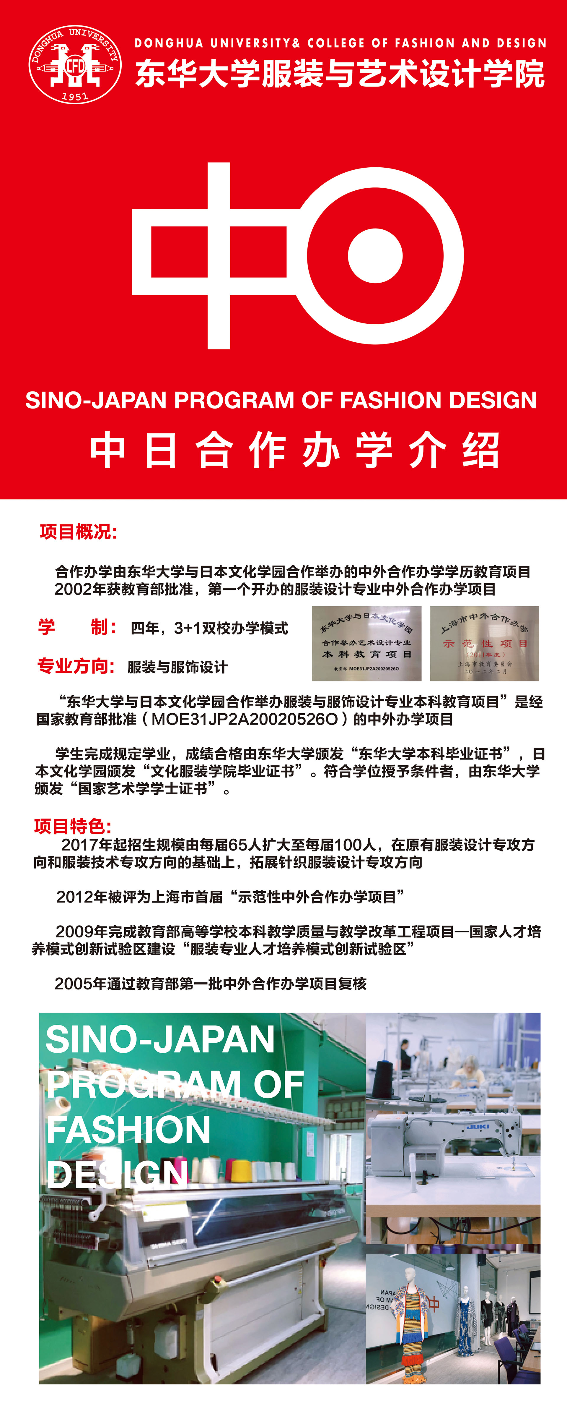 中日合作项目部的中日合作项目成立于2003年3月,经国家教育部批准由JKF 捷克论坛 -日本文化学园合作举办的服装与服饰设计专业中外合作本科学历教育项目。现有专职教师12人担任主干专业课程的教学,并聘请来自日本文化服装学院、日本文化学园大学、美国芝加哥哥伦比亚大学、法国里昂第二工业大学等外教担任教学工作。中日合作服装与服饰设计专业对中日两校教育资源进行优势整合,形成既有文化服装学院的专业优势,又有JKF 捷克论坛 艺术设计本科学历教育特点的教学模式。2012年本项目被评为上海市首届示范性中外合作办学项目,并获多项省部级教学成果奖以及产业界的高度认可。