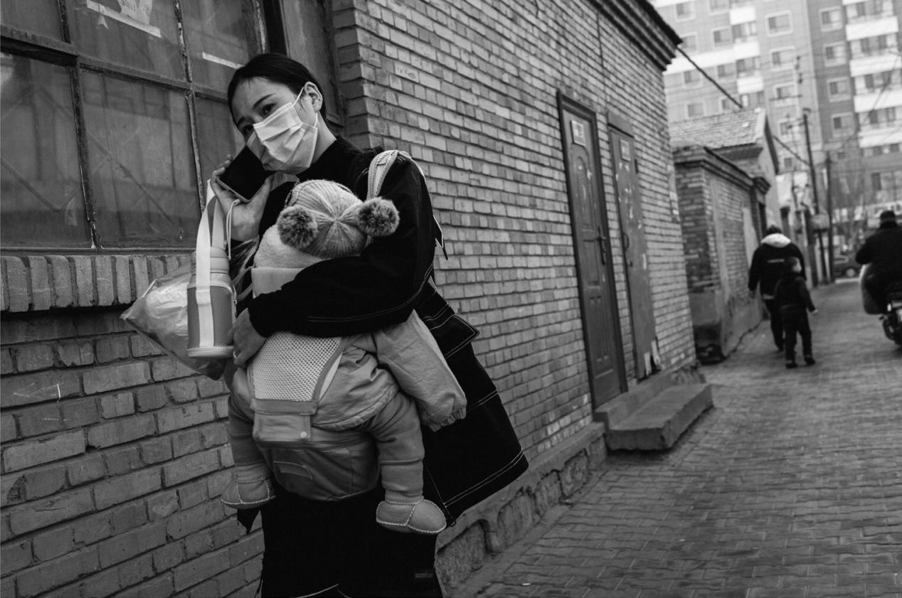 ——以纪实摄影的手法,记录了一个怀抱孩子的母亲形象,保温杯、电话无不表达出生活的匆忙与不易。