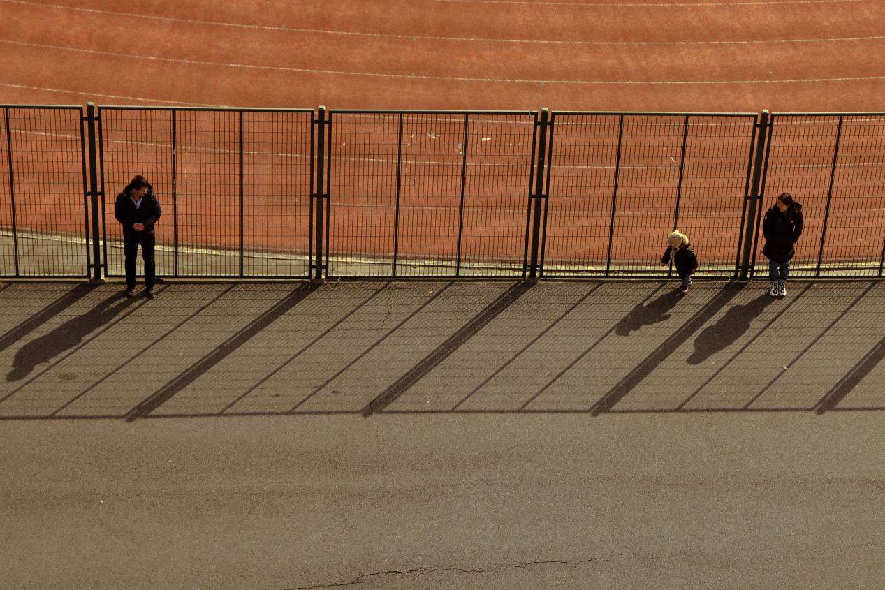 ——跑道、栅栏、投影给人带来韵律与规则,父母关注的目光聚焦于孩子,一派生活的乐章。