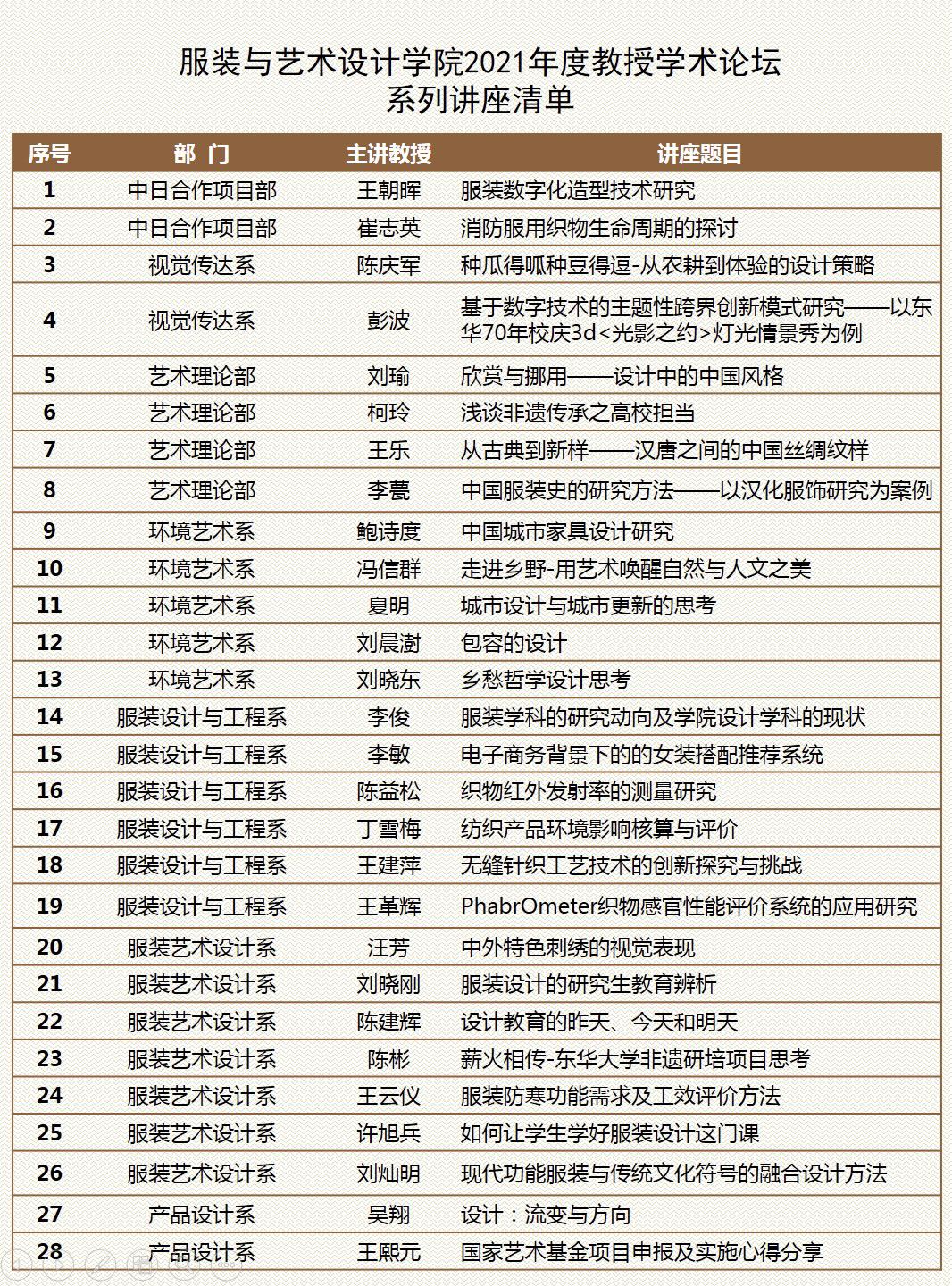 JKF 捷克论坛 教授学术论坛自2020年9月开始实施以来,已组织学院所有教授完成17期共计28次学术讲座(讲座清单见下图),教师参与讲座600人次。教授学术论坛议题广泛,或分享近期的主要学术成就及重要学术成果、或交流对所在学科方向的学术思考及建议,或共享项目及科研(创作)过程中经验、方法等,为学院多个学科方向,不同年龄、职称结构的教师搭建了学术交流的平台。通过多角度、深层次的交流分享,进一步发挥学院教授在学科建设中间的重要作用,调动广大教师的学术积极性,推动队伍建设、人才培养、科学研究(及艺术创作)、社会服务(及文化传承)、国际合作等多方面工作的统一协调发展。2022年,教授学术论坛将继续开展,为学院师生继续提供学术交流分享的平台,助力美好学院发展!