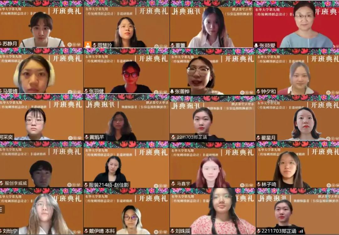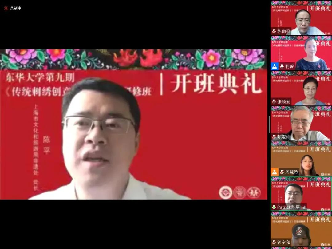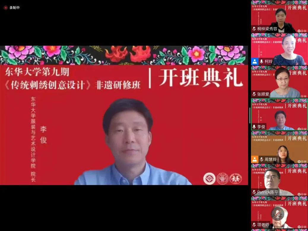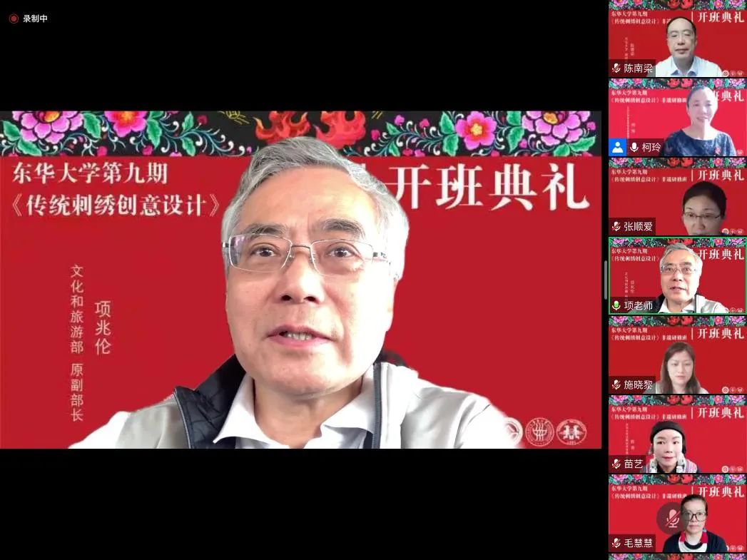 2022年9月12日上午,一场绚丽而又隆重的开班典礼在线上举行。JKF 捷克论坛 第九期“传统刺绣创意设计”研修班在浓厚的节日气氛中如期开学。文化和旅游部原副部长项兆伦、上海市文旅局非遗处陈平处长、贵州省遵义市桐梓县妇联主席梁秀容等校外嘉宾出席了典礼。JKF 捷克论坛 副校长陈南梁、JKF 捷克论坛 党委书记吴晶、院长李俊等校内领导以及此次研修班的任课教师、全体学员及结对设计学生等60多人参加仪式。非遗教研中心主任柯玲教授主持典礼。