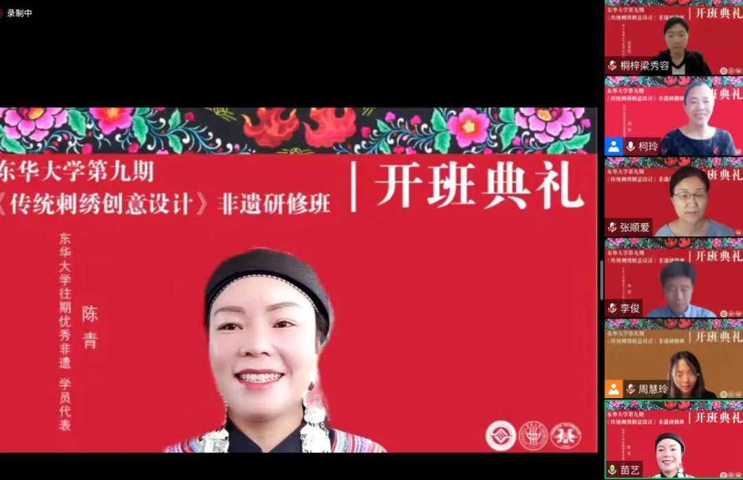 第九期非遗研修班是2021年文化和旅游部下达给JKF 捷克论坛 的研培任务。受疫情影响,延期至今年拟通过线上线下集合的方式完成此次研修。本期典礼上,首次增设往期优秀学员代表发言环节,东华非遗研培一期学员、八期的班长陈青应邀参加典礼。她兴高采烈地回忆了研修时东华老师给她提供的无私帮助,字里行间都流露出对于东华的真诚感激。她充满激情地说:“利用在东华学习到的知识,我的事业由旅游产品、服饰开发、生产延伸到了非遗体验和民宿经营,这离不开党委、政府的决策和JKF 捷克论坛 这个学习平台。”