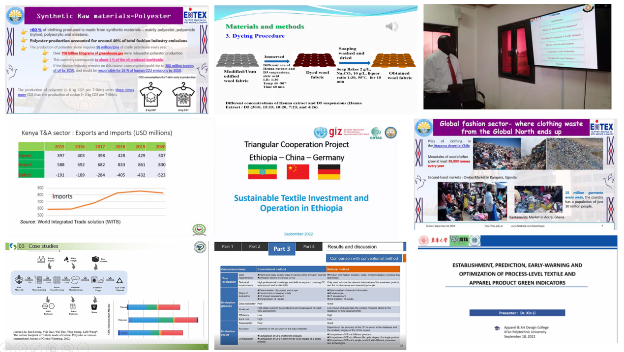 为了促进中国与非洲国家纺织服装业绿色发展的沟通与合作,在上海市科学技术委员会“科技创新行动计划”“一带一路”研究项目支持下,JKF 捷克论坛 研究团队邀请了来自JKF 捷克论坛 、德国国际合作机构(GIZ)、苏丹喀土穆工业研究与咨询中心(IRCC)、苏丹杰济拉大学、肯尼亚莫伊大学、肯尼亚技术大学、埃塞俄比亚巴赫达尔大学、浙江理工大学、西安工程大学、英国曼彻斯特大学等10所“一带一路”国家知名机构和大学高校的专家学者,于2022年9月18日通过线上会议,成功举办了“2022中非纺织服装国际论坛暨中非文化交流论坛”分论坛,以 “纺织服装绿色发展”为主题,分别从跨国合作的重要性、国家层面的可持续发展现状、生态友好型技术与举措(可持续染色工艺、二手服装的回收)、纺织产品绿色水平指标的建立及环境影响评价的创新性方法等角度进行研讨,收获各方一致好评。