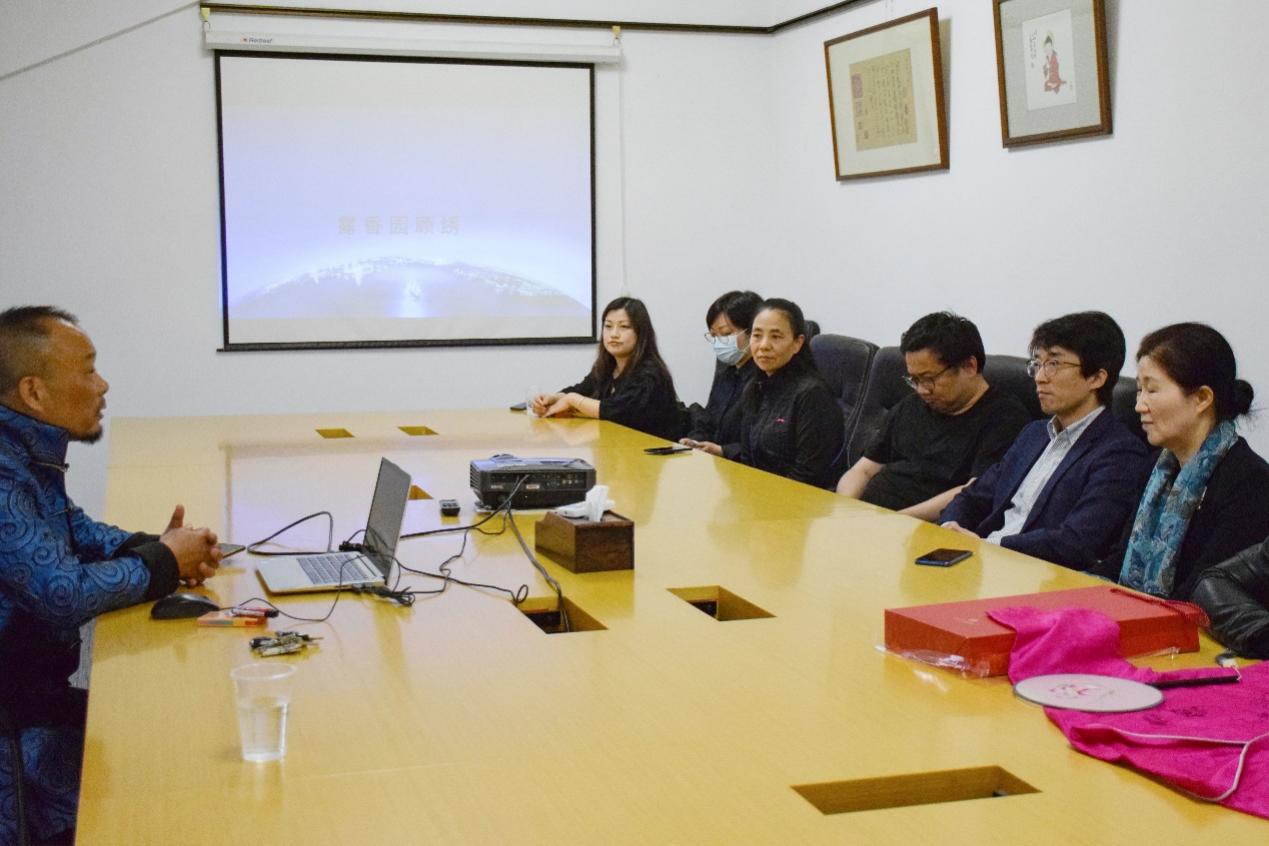 上海露香园顾绣研究院的黄翼飞院长和费菲一起带领回访小组参观了展厅,展厅中的顾绣作品精美秀丽,黄院长介绍,他们制作作品的方式,是由多个绣娘完成一幅作品,每个部分都由最擅长这种刺绣的绣娘完成,以臻完美。参观之后黄院长、费菲与回访小组进行座谈,黄院长讲述了自己在非遗商业化方面的经验,回访小组的老师、上海非遗保护中心钱主任就非遗的商业化路径做出了不同层面的解读与探讨。老师们对于顾绣的多样化呈现,如与服装和文创的结合等提出了建议,黄院长表示受到了很大启发。