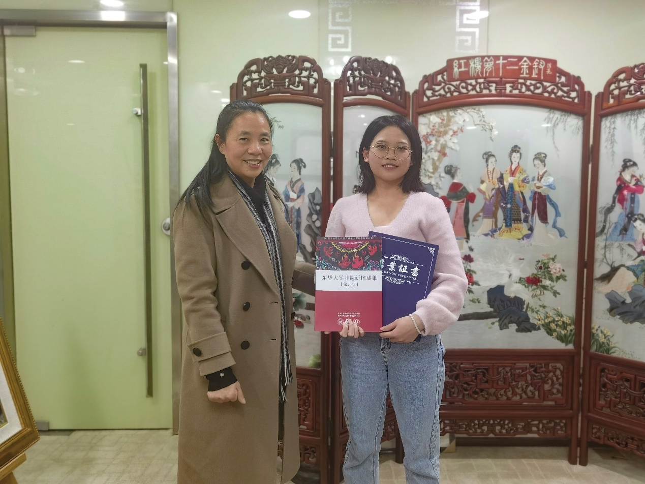 2023新年伊始,尽管开学季工作无比忙碌,非遗教研中心还是决定先去见一见第九期学员中的3位上海学员,登门颁证、回访和调研。从3月1日到3月10日,回访团队在非遗教研中心主任柯玲教授带领下依次回访了松江顾绣学员陈华琼、恒源祥绒绣学员蒋馨瑶及露香园顾绣学员费菲。不仅给她们颁发了结业证书和荣誉证书,还亲手送上了中心新鲜出炉的带着东华研修记忆的《东华非遗研培成果(第九期)》,全程充满了欣喜、感动和欢乐。