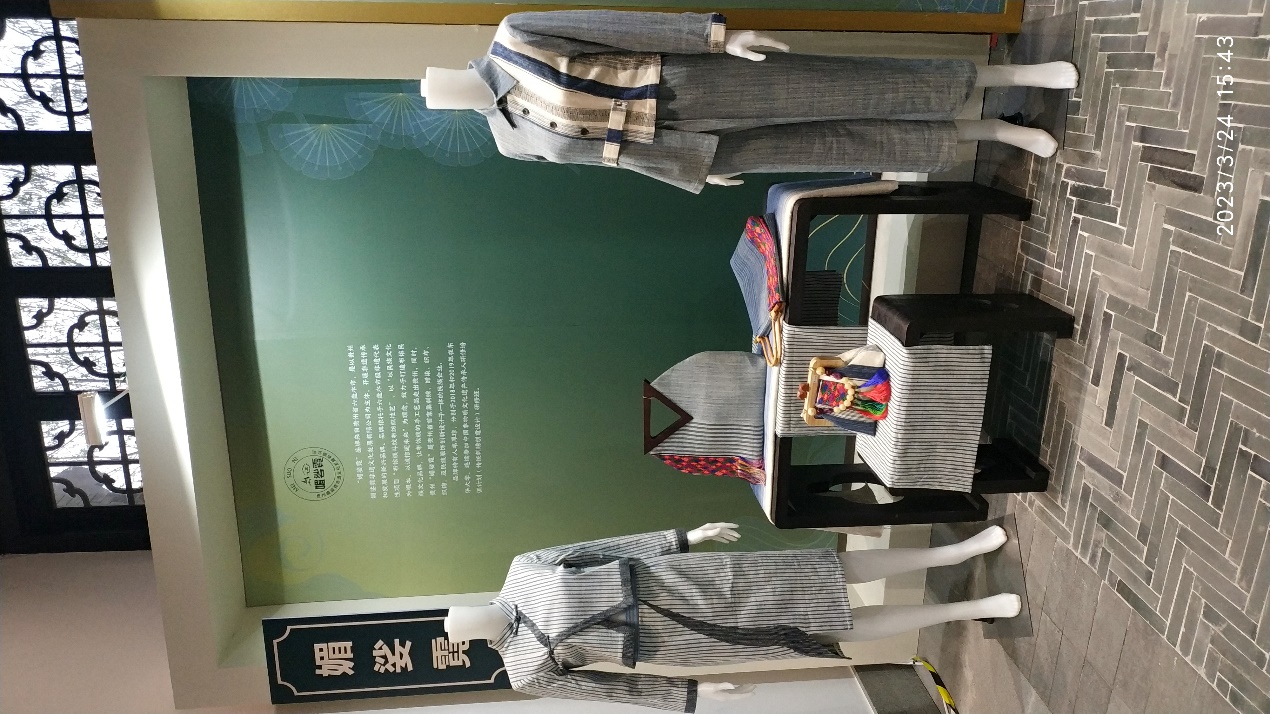 展览现场,一位广东本地客家山歌传承人被秀丽作品优雅的蓝色深深吸引,希望为自己的客家山歌设计团队服装,专程到现场助阵的笔者马上给她们牵线。