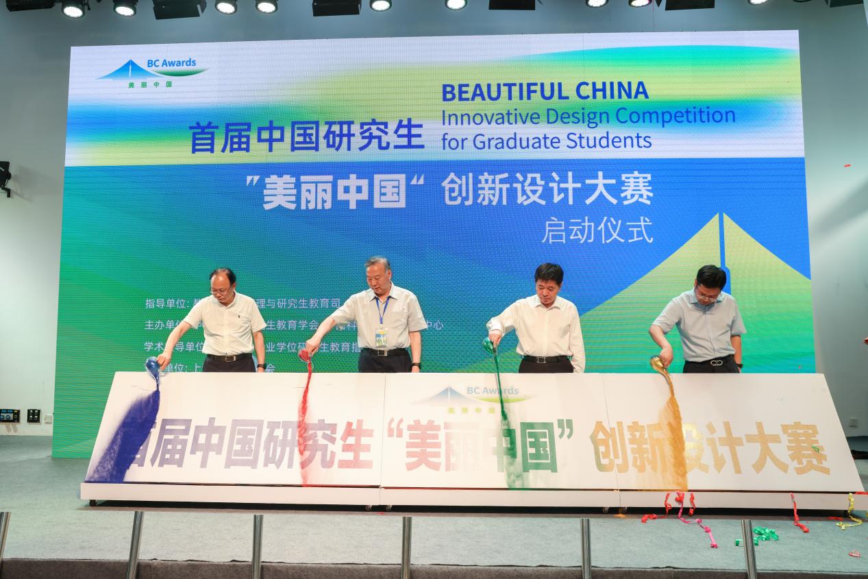 随后,与会的领导嘉宾通过共同倒沙,象征着创新、责任、青春、活力……金色沙砾缓缓落下,积少成多,“中国研究生‘美丽中国’创新设计大赛”几个金色大字逐渐显现,标志着大赛正式拉开帷幕。