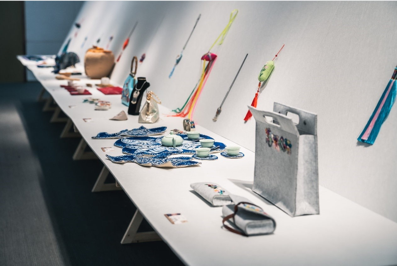创新设计展区在中间展台上展示的,是学员们在非遗教育研究中心教学分管施晓黎老师指导下完成的“文创产品创意设计”课程作业,包括一个系列三件以上文创作品,以及为庆祝即将到来的端午节而设计的造型各异的香囊。静心细嗅,你一定会发现展厅里充溢着浓浓的端午节日芬芳!学员们在施晓黎老师的启发下,将自己的巧思注入文创作品设计中,许多设计让人惊呼:“好妙!”