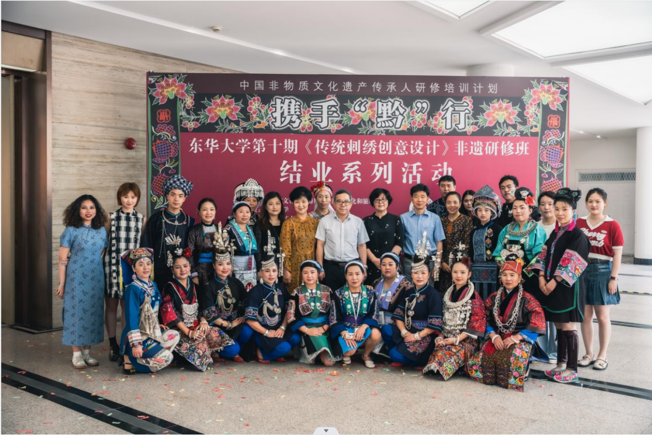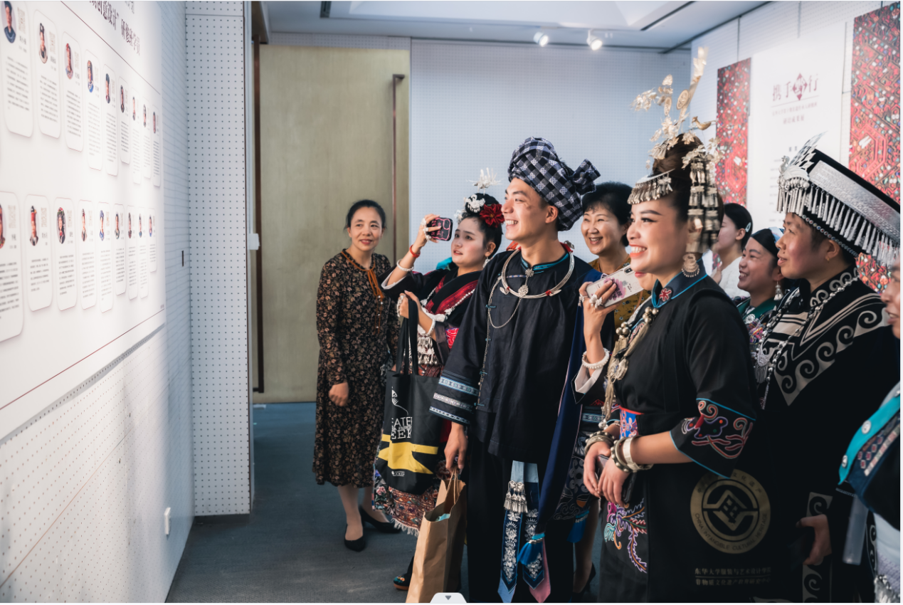 学员们的设计作品虽然以静态展呈现,但里面包含的情感却是流动的,背后蕴含的故事也鲜活而富感染力。文创作品中也充满了学员们的奇思妙想。学员杨翱为一家四口设计了礼物:妈妈的手机壳、女儿的娃娃和爸爸的手提箱,三个礼物上都使用了盘绣、蜡染、贴布等技艺;学员袁帅别出心裁地将研修班老师和助教们的形象都绣在了发卡上,她说希望用这种方式来感谢非遗中心老师和助教们对她的帮助;王月琴则用布艺和刺绣做了一套仿真“茅台酒”,从酒罐、酒杯到打酒葫芦一应俱全,观展嘉宾看到了都会心一笑;吴妹香的茶席5件套上用盘轴滚边绣绘出贵州锦屏的特色活动,她说要把家乡的文化留在上海、留在东华。