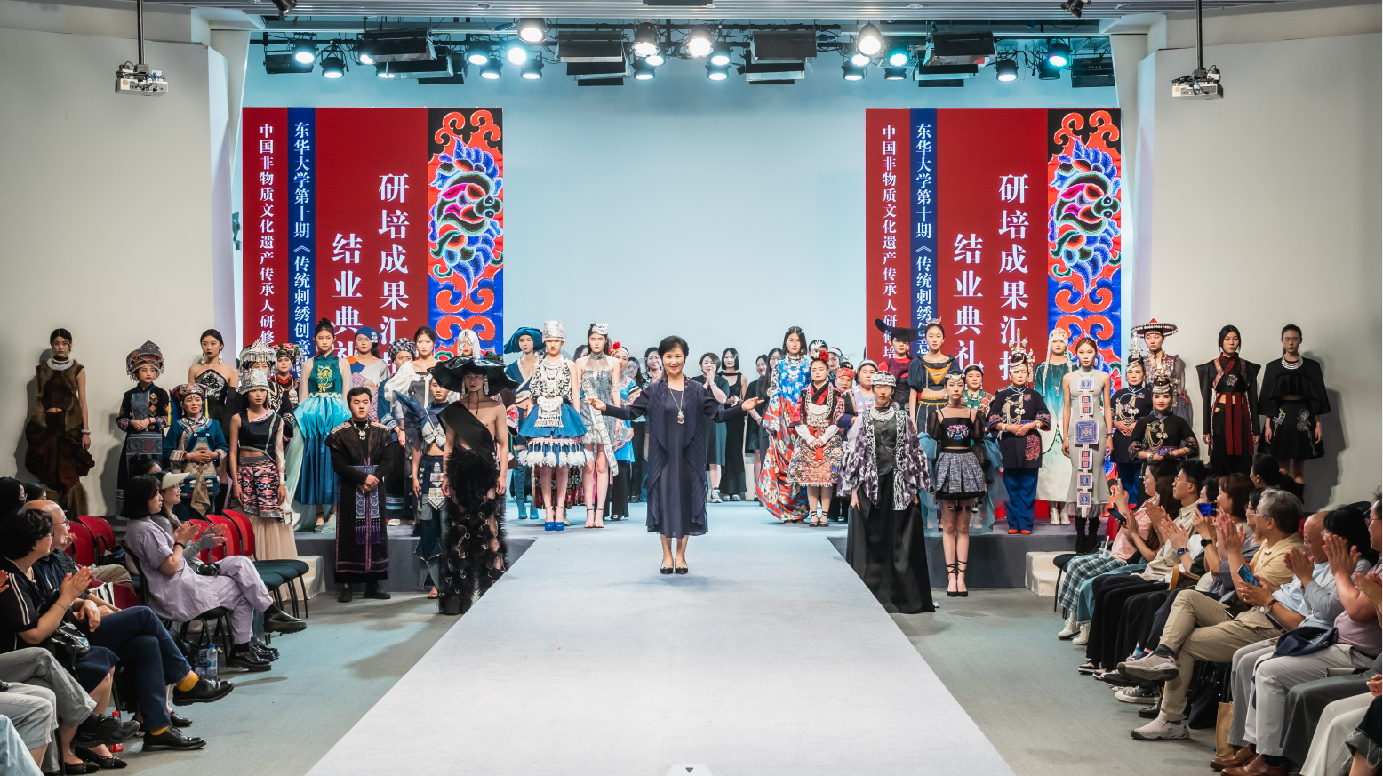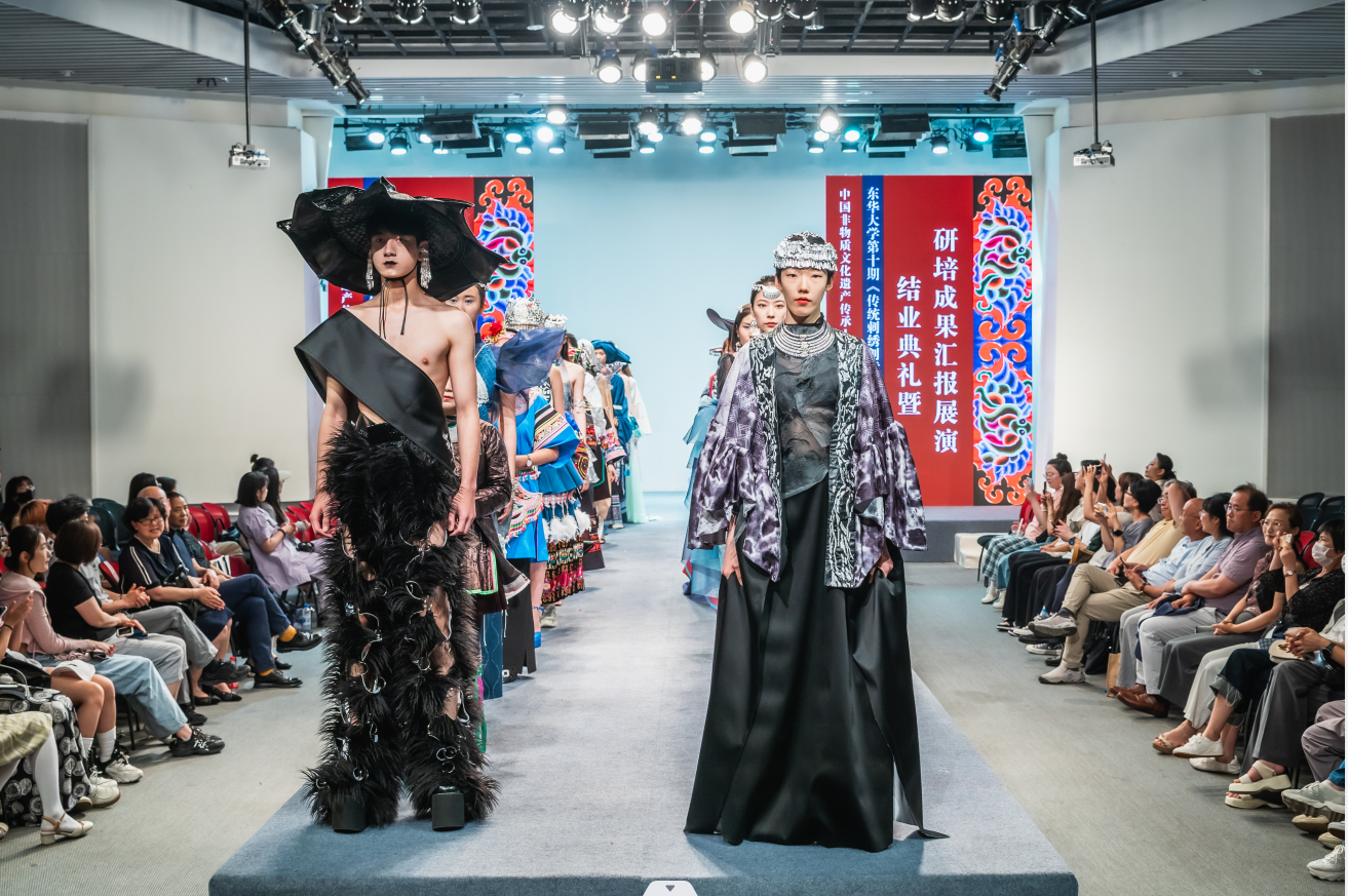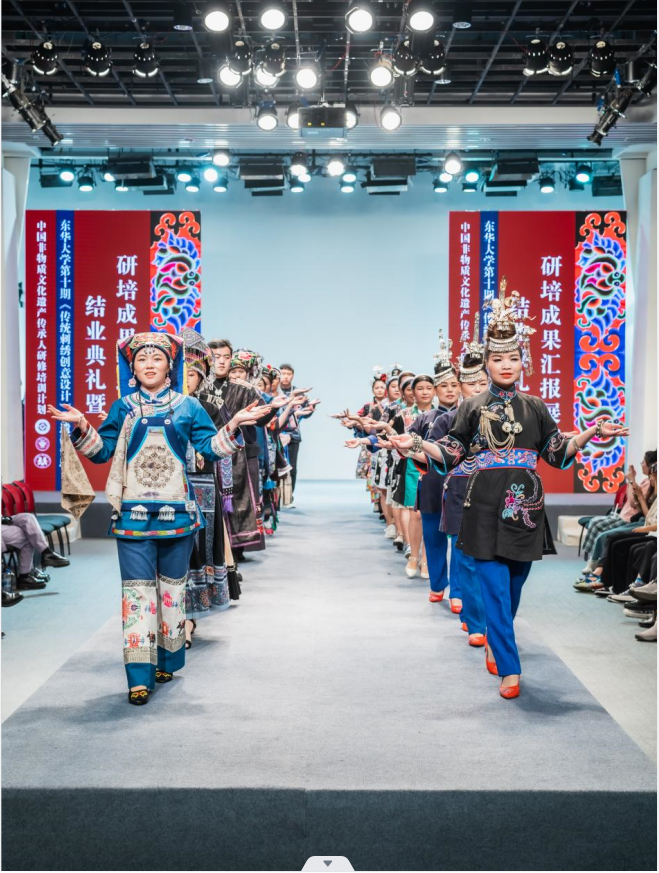 6月10日下午2点,JKF 捷克论坛 延安路校区逸夫楼二楼表演厅的结业成果汇报大秀是东华第十期非遗研修的高光时刻。由服装学院非遗教育研究中心教学指导张顺爱副教授手把手指导,人盯人把关完成的22套由非遗学员和中外高校设计专业学生合作完成的非遗元素创新设计时装正式发布。