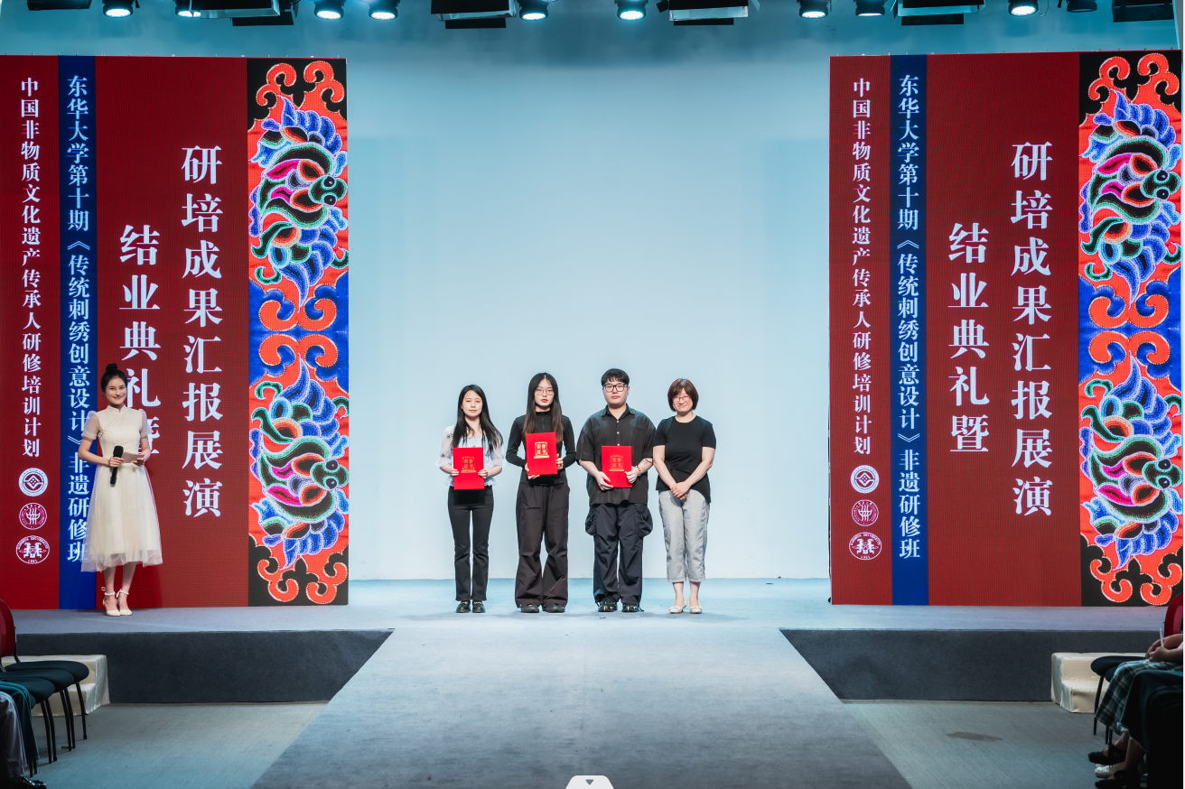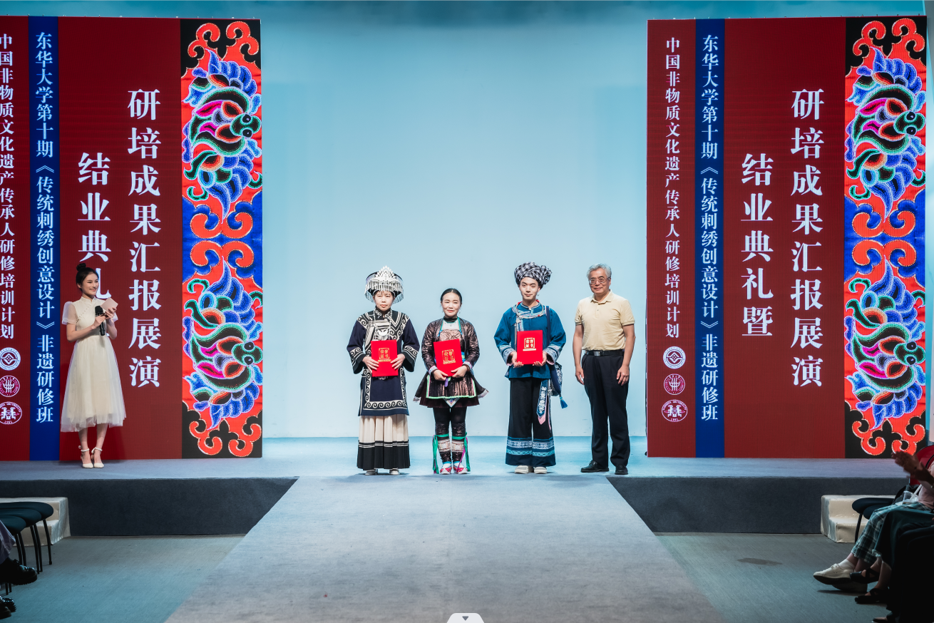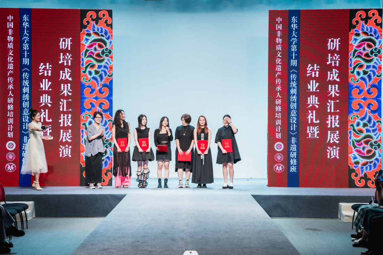 6月10日下午2点,JKF 捷克论坛 延安路校区逸夫楼二楼表演厅的结业成果汇报大秀是东华第十期非遗研修的高光时刻。由服装学院非遗教育研究中心教学指导张顺爱副教授手把手指导,人盯人把关完成的22套由非遗学员和中外高校设计专业学生合作完成的非遗元素创新设计时装正式发布。