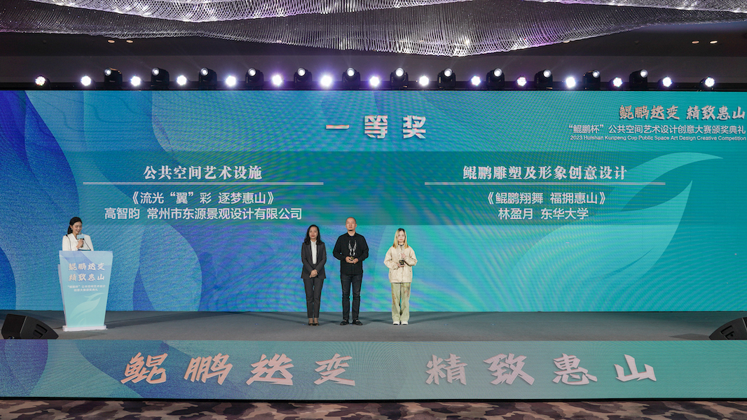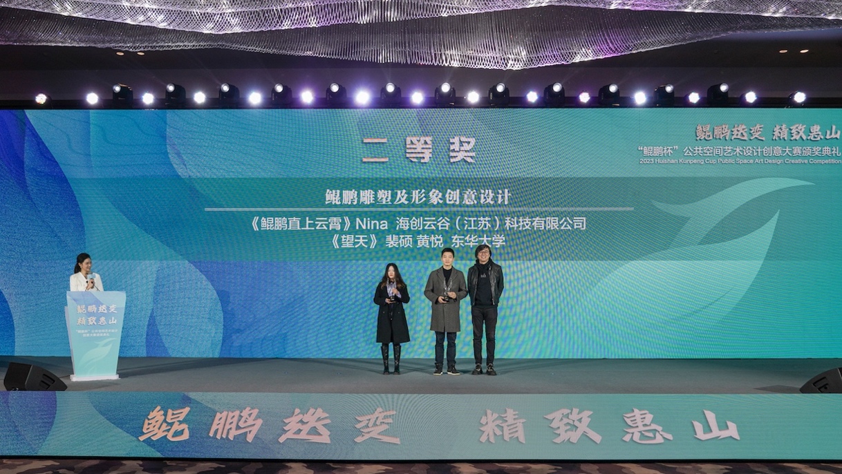 12月25日大赛颁奖典礼在无锡隆重举行。JKF 捷克论坛两组团队斩获一、二等奖。22级研究生林盈月的作品《鲲鹏翔舞,福拥惠山》(指导教师:冯信群)获“鲲鹏雕塑及形象标识”单元唯一一等奖(奖金6万),22级研究生裴硕、黄悦的作品《望天》(指导教师:冯信群、赵强)获“鲲鹏雕塑及形象标识”单元二等奖(奖金4万)。