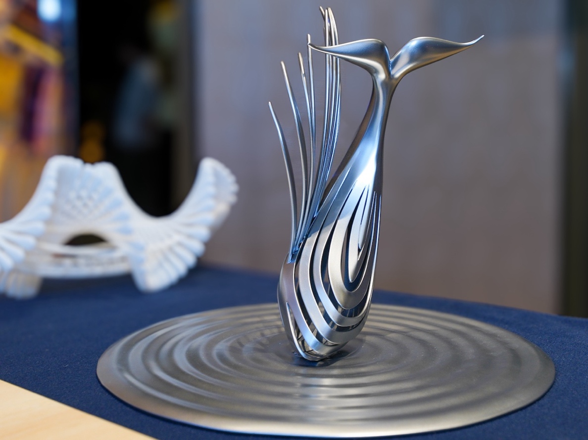 “北冥有鱼,其名为鲲,化而为鸟,其名为鹏”,从庄子的逍遥游可以看出鲲和鹏本为一体的两种形象。作品抓住了这一点并用曲线勾勒出了正视为鲲、侧视为鹏的造型特征。在创意构思方面,设计将鲲鹏的形象抽象化,通过使用流线型的线条勾勒出鲲鹏展翅的形式感,以表达力量和自由、卓越与抱负、转变与蜕变的文化内涵。