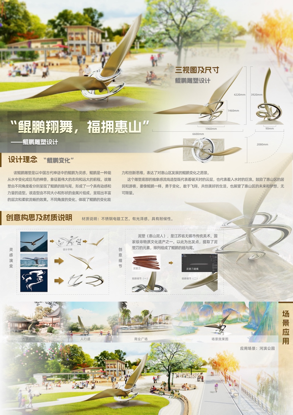 鲲鹏雕塑以中国古代神话中的鲲鹏为灵感。鲲鹏是一种能从水中变化成巨鸟的神兽,象征着伟大的志向和远大的前程。雕塑由不同角度看分别呈现了鲲鹏的翅与尾,形成了一个具有动感和力量的造型。造型由不同大小和形状的金属片组成,呈现出丰富的层次和柔软流畅的效果。不同角度的形变体现了鲲鹏的变化能力和创新思维,表达了对惠山区发展的鲲鹏迭变之愿景。雕塑底部的抽象感流线造型既代表着破天时的云层,也代表着入水时的巨浪。鼓励了惠山区的居民和游客,要像鲲鹏一样,勇于变化,敢于飞翔,共创美好的生活,也展望了惠山区的未来和梦想,无可限量。。