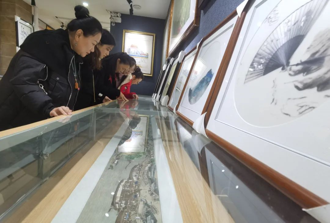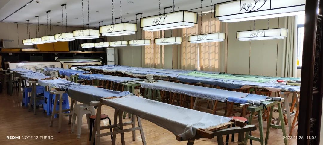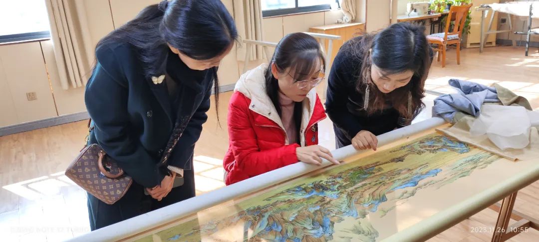 开封汴绣厂是著名国营老厂。荣誉墙上挂着几十块闪着金光的铭牌。一楼展示厅中更是挤满了汴绣精品。令回访组惊喜的是二楼的传习室宽敞明亮,绣画绷整齐排开。因为周围的学校开设汴绣课程定期有学生来此学习体验。不少学校现在强调“双师型”教育,所以学习汴绣的老师也越来越多;而逢到寒暑假,外地的实践团队也很多。平时的郭华既忙于参加外出的各类演示体验活动,也忙于在此教授学校的师生来学习体验。二楼绣绷上有一幅郭华绣制进程中的《千里江山图》所有人看到了不禁惊呼。